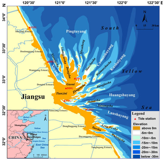 The RSRs bordered by the Old Yellow River mouth in the north and the Yangtze River estuary in the south located in the northern coast of Jiangsu province, China (Figure 1). From Sheyang estuary to Tanglugang estuary, it covers a sea area of more than 20,000 km2 with a length of about 200 km and a width of about 90 km. More than 70 sand ridges with various dimensions radiate from the Tiaozini towards the open sea. The water depth ranges from 0 to 30 m (theoretical depth base) [29]. The exposed tidal flats with an area of more than 2000 km2 are typically dozens of kilometers wide with an average slope of approximately 0.2% and an increase in slope to 1.5% near the tidal creeks [27]. The bottom sediment of the RSRs mainly consists of fine sand [30], with a mean grain size of 62.5–250 μm, and the sediment mixture is well-sorted [31].