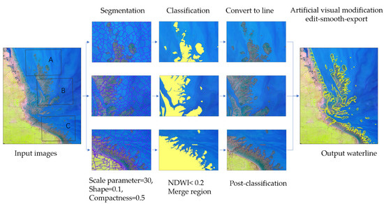 The ‘waterline’ is defined as the boundary between a water body and an exposed tidal flat in a remotely sensed image. The tidal flat was characterized by a low reflectance from the exposed surface, a high seawater turbidity, and a variation in moisture content that was in turn governed by grain size, local slope, and the existence of tidal channels or creeks [35]. Therefore, in different areas, different bands or spectral digital number values of remote sensing image should be determined to extract waterlines over the entire region [33]. In this study, a method based on object-oriented classification was used to extract waterlines. The object-oriented classification method makes use of the features of shape, texture, and landscape to realize high-precision classification results using the technologies of images segmentation, multiple feature analysis and extraction, sample selection, and supervised classification [36]. At the same time, object-oriented classification can establish different segmentation thresholds for different images and can directly obtain the vector surface of each object, so it can effectively avoid the problem of broken lines in the process of waterline extraction.