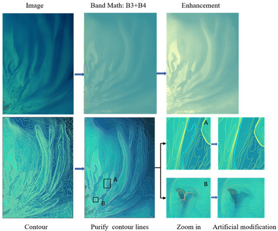 In this study, based on radiation contours, the sand ridge lines in the RSRs were extracted through visual interpretation. The extraction process is briefly described by taking the HJ−1 image on 26 April 2012 as an example (Figure 4). It mainly includes four steps: image selection, characteristic band (red band + near-infrared band: B3+B4 in HJ−1) determination, piecewise linear enhancement processing, and contour extraction. ① Image selection: Through the analysis of the tide situation corresponding to the historical satellite images, it was found that the image about 2 h after the lowest tide should be selected as the data source. After the ebb tide, flow velocity is small, and the sediment is not easily suspended. At this gap time, the concentration of suspended sediment is low, and the underwater sand ridges are clearly visible on the acquired remote sensing image. ② Characteristic band determination: A previous study made it apparent that the correlation coefficients between spectral band and total suspended matter (TSM) become larger as the wavelengths shift from the blue to the near-infrared bands [37]. In this study, the correlation between the measured topographic data and various band combinations was analyzed. It was found that the ‘red band + near-infrared band’ (B3+B4 in HJ−1) combination has the greatest correlation, which is suitable for distinguishing deep channels and underwater sand ridges. ③ Piecewise linear enhancement processing: Piecewise linear contrast stretching can zoom in on the area where the digital number (DN) value distribution is more concentrated, highlight the fine structure, and realize the extraction of subtle features. ④ Contour extraction: The characteristic band image after enhancement processing was used to extract the contours. Finally, according to the distribution of contour lines, the underwater sand ridge lines were drawn through visual interpretation. As shown in Figure 5, comparing the 2012 remote sensing image with this surveyed DEM, it was found that the distribution of the sand ridges was very consistent. The DN contour of the remote sensing image can refer to the terrain contour.