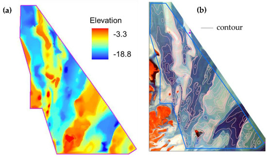 Comparison with surveyed data and extracted image of sand ridge lines; (a) digital elevation model (DEM) based on surveyed data; (b) overlay map of image and contours of DEM.
