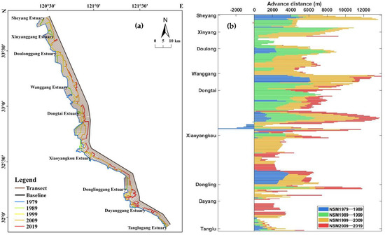 (a) Shorelines, baselines, and transects of the RSRs; (b) t (NSM) of shoreline in different periods of the RSRs from 1979 to 2019.
