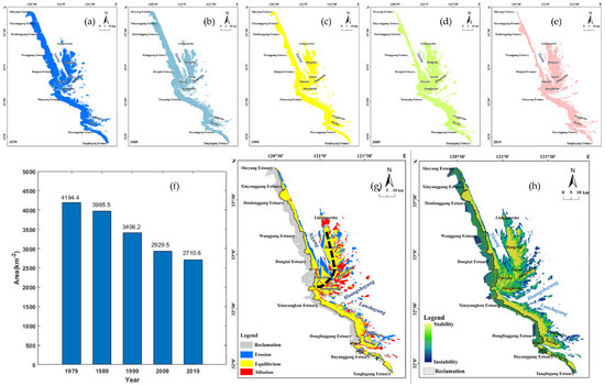 (a–e) Distribution map of exposed tidal flats from 1979–2019; (f) area comparison between five periods; (g) overlay map between 1979 and 2019; (h) stability spatial distribution map based on overlay analysis of five polygon layers (a–e).