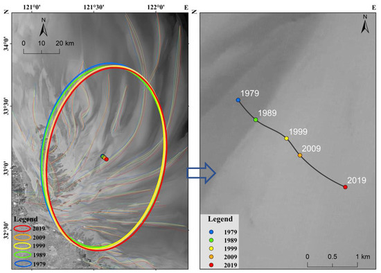 The standard deviational ellipse method was used to analyze the change of sand ridge lines. As shown in Figure 9, standard deviation ellipses and geographic centers in different periods were obtained, and morphological parameters were counted (Table 3). Overall, the shape of the directional ellipse has not changed much in the past 40 years, and the change range of the major axis and the minor axis are both within 5%, indicating that the overall radial shape of the sand ridge group is relatively stable. However, the center point of ellipse showed a trend of gradually moving southeast (Table 4). From 1979 to 2019, the moving distance is nearly 4 km, and the direction is southeast (135°), with an average annual movement of 100 m. Compared with other periods, the movement of sand ridges has accelerated in the last 10 years (2009–2019).