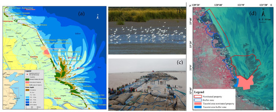 (a) planed polders in Jiangsu Tidal Flats [39]; (b) tidal flat birds; (c) reclamation photo; (d) the two components of the migratory bird sanctuaries along the Coast of Yellow Sea–Bohai Gulf of China (Phase I) [6].