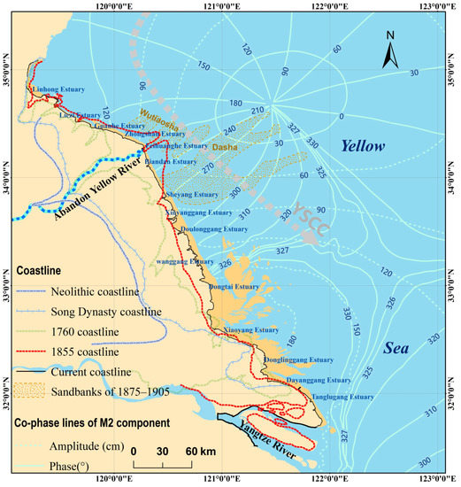 Historical shoreline evolution and tidal wave system. The historical shorelines are collected from Zhang 1985 [41]; subwater sandbanks are collected from Zhou et al. 2014 [6]; co-phase lines of M2 component in southern yellow sea are collected from Xu et al. 2016 [16].