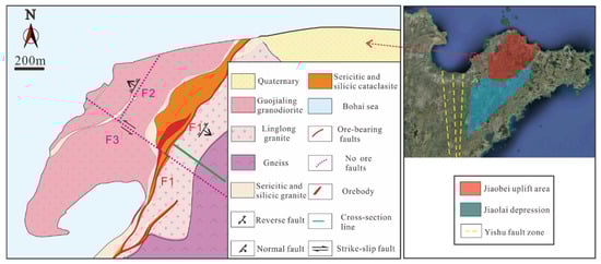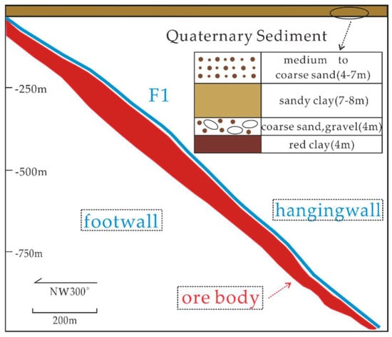 The geotectonic location of the Sanshandao Gold Mine is in the Jiaobei uplift area of the Jiaobei terrane on the southern margin of the North China Platform, bound by the Yishu fault zone, the most active fault zone in eastern China, to the west [66], and by the Jiaolai depression to the south. The Sanshandao gold deposit is controlled by the north-northeast (NNE) to the northeast (NE)-trending Sanshandao-Cangshang fault that belongs to the Yishu fault zone [67] (Figure 2). There are three controlling faults, F1, F2, and F3 (Figure 2), as well as some typical secondary joints in the mining area: Fault F1 (dipping southeastward) is the ore-bearing fault (reverse fault) with an extension depth of about 1000 m, which is located in the northeastern section of the Sanshandao–Cangshang fault zone [68]. The gold ore body is altered rock type gold deposits controlled by the F1 fault. The attitude of F1 is NE 35–40°/SE 38° (“NE 35–40°” refers to a fault strike in the 35–40° range, “SE” refers to a fault dip, “38°” refers to the dip angle of a fault, the following expressions have the same meanings) with slight variations in the strike and dip directions [69]. Fault F2 is a small-scale normal fault with an attitude of about NE 15°/NW 60–80°. The strike-slip fault F3 has the attitude of NW 300°/SW 90°, with an extension depth of about 600 m, extending westward to Laizhou Bay. Quaternary sediment (about 25 m) covers the mining area. In terms of hydrogeological features, quaternary sediment is divided into the following four units from top to bottom: (a) the first aquifer (medium to coarse sand) ranges in thickness from 4 to 7 m; (b) the first aquiclude (sandy clay) ranges in thickness from 7 to 8 m; (c) the second aquifer (coarse sand and gravel) has an average thickness of 4 m; and (d) the second aquiclude (red clay), which has an average thickness of 4 m, lies above the weathered crust (Figure 3). The bedrock consists of sericitic and silicic granite, pyrite sericite, gneiss, cataclasite, etc. The in-situ stress field of the Sanshandao Gold Mine is dominated by horizontal stress: The maximum principal stress lies in a nearly horizontal direction (NWW), and its value is larger than the self-weight stress of the rock mass. The bedrock is subjected to strong weathering and tectonic effects, and fractures are relatively developed, forming a densely developed fracture zone of fault F1. According to the data sharing infrastructure of the National Earthquake Data Center (http://data.earthquake.cn, accessed on 8 December 2021), there have been four earthquakes with a depth of less than 7 km and a magnitude below 5 in Laizhou city thus far (➀ Ms 3.0; Location: 120.02°E, 37.11°N; Depth: 6 km ➁ Ms 4.6; Location: 120.02°E, 37.10°N; Depth: 6 km ➂ Ms 3.3; Location: 120.01°E, 37.12°N; Depth: 6 km ➃ Ms 3.2; Location: 120.03°E, 37.10°N; Depth: 7 km). The seismic peak acceleration is 0.15 g.