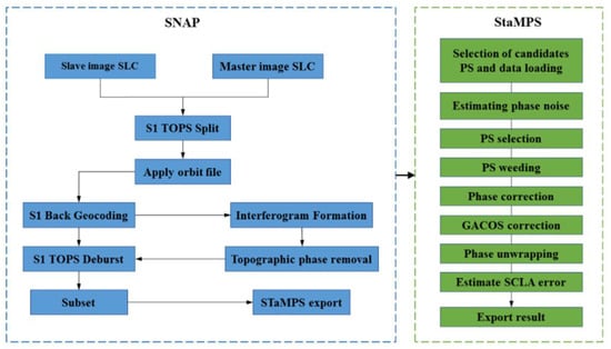 The flowchart of the whole PSI processing chain, using SNAP program and StaMPS algorithm (adapted from [5]).