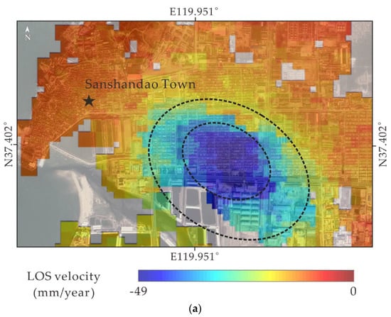 The subsidence funnel in the main mining area: (a) PSI result: ground movements away from the satellite are shown with cold colors; (b) SBAS result: ground movements away from the satellite are shown with cold colors.