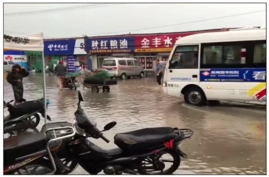 According to the LOS deformation results, we discovered a similar deformation pattern through two time-series InSAR techniques: the shape of the subsidence funnel resembles an egg. At the same time, they all possess a stratified structure. The external part has a lower LOS velocity value, and the inner part has a higher LOS velocity value. Moreover, the two subsidence funnels obtained using the PSI and SBAS techniques share the same scope, between 119.94°E and 119.96°E, and 37.39°N and 37.41°N. Figure 8 shows the important construction areas in the study area. As displayed in Figure 9, a general trend of negative LOS velocity is distributed in the important construction areas. The heavily subsided area is lower than the surrounding area. In the rainy summer, rainwater gathers due to poor drainage (Figure 10), affecting transport in Sanshandao Town. However, the specular reflection of radar waves by water surface results in missing the deformation data in the fish farm area. There is a gradual change in LOS velocity from negative values to positive values in areas away from the important constructions. It turns out that the subsidence may be bounded by the F3 fault (Figure 2). As Figure 9 shows, the ground deformation extends along the northwest and southeast direction, similar to an oblique egg in shape (the same part is outlined by a solid, yellow, rectangular line in Figure 1, using the PSI and SBAS techniques).