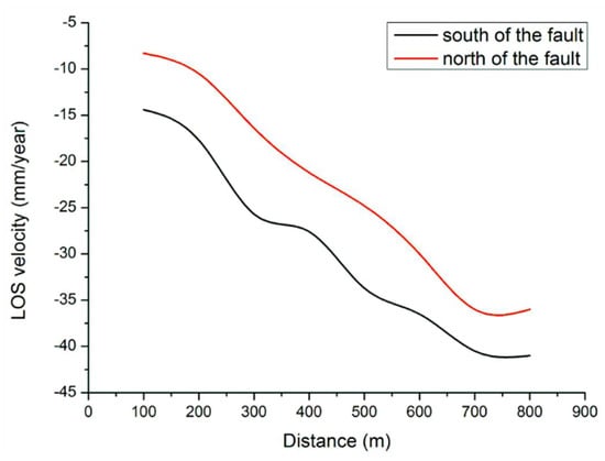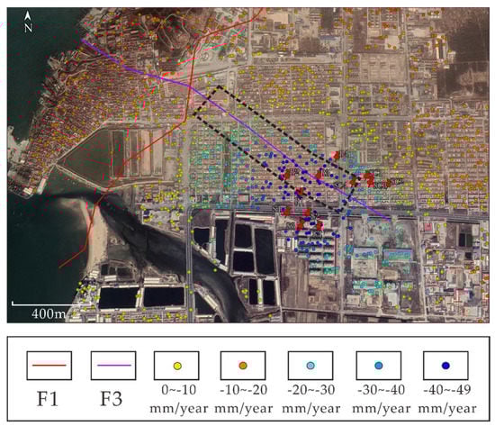 As displayed in Figure 9, the subsidence deformation may be bounded by the F3 fault, as the ground deformation extends along the northwest and southeast direction, similar in shape to an oblique egg. We have selected several sites in the dashed box (black) in Figure 11 from the northwest to the southeast for LOS velocity analysis. It turns out that the subsidence rate is different on both sides of the fault. The south area has a bigger LOS velocity value than the north area (Figure 19). From a qualitative and quantitative perspective, our results suggested that the fault F3 may restrict and affect the subsidence development. The ground subsidence shape is affected by the discontinuous interface (in this case, the fault) which is the product of internal and external dynamic geological processes. In the case of mining, the heterogeneous rock mass with geological discontinuities affects stress redistribution. Therefore, the ground subsidence can be influenced [5,93,94]. In addition, there have been no earthquakes in Laizhou City since 2018 according to the earthquake data. The subsidence does not appear to have been caused by strong fault movement. Unfortunately, we cannot discriminate the mechanism between ground subsidence and fault attributes due to a lack of enough underground mining information and field tests. Further studies on this aspect will be summarized in our next study.