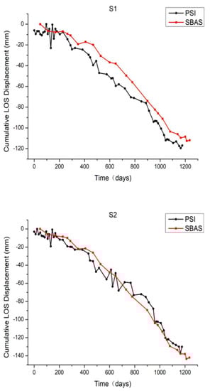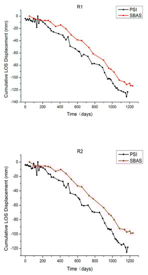 As mentioned before, we performed PSI processing with the 54 radar images obtained from the Sentinel-1A satellite. The cumulative LOS displacements in several representative sites were provided in the previous section. Moreover, we attained more relatively continuous subsidence displacement values compared with SBAS processing. Therefore, we chose the PSI results as the following discussion object. Firstly, we broke the cumulative LOS displacement results into two parts for analysis, using the date 20,200,801 as the cut-off point. Secondly, we performed linear fitting on the two parts of the data. Table 2 shows that the first part has a low subsidence velocity and the second part has a higher subsidence velocity. Multiple potential mechanisms that trigger the subsidence phenomenon could exist, as demonstrated by the distinct temporal behavior of the LOS displacement value. For instance, this phenomenon can be explained by changes in mining quantity.