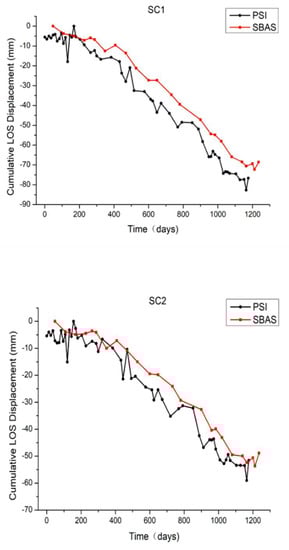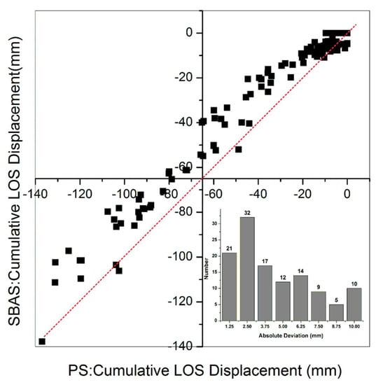 However, both of the LOS displacement results in the same site are not totally coincidental, and the common character of the displacement results indicated that the PSI displacement value is bigger than the SBAS displacement value. We selected several sites (as shown in Figure 11: R1-R4, S1-S4, SC1-SC4) for error analysis. As shown in Figure 18, the scatter plot with regular dispersion shows a low standard deviation. We used IBM SPSS (version 22) for error analysis: the standard deviation is about 6 mm, and the deviations do not have normal error distribution (Kolmogorov-Smirnov consistency test [91,92]), which implies that the results are reliable. The absolute deviation result is displayed in the lower right corner of Figure 18. We calculated the root mean square error (RMSE) between the results of the PS and SBAS. The RMSE value is about 8 mm. In general, according to the results of the previous chapters and the error analysis, the results obtained using the PSI and SBAS techniques are in good agreement from both the qualitative and quantitative perspectives. The potential reasons for this phenomenon are described below: both time-series InSAR techniques have different principles and algorithms, as well as work platforms. For instance, the SBAS technique is an analysis method for the multi-master-image InSAR time series that uses interferometric pairs of small baselines to obtain the surface deformation; the PSI technique is an analysis method for the mono-master-image. SBAS regards better nonlinear movements, and the SBAS technique reduces the decorrelation by exploiting distributed targets; PSI enables a precise characterization of the linear deformation affecting urban areas, and PSI can detect more PS in urban areas. Therefore, the results are not in perfect accord.
