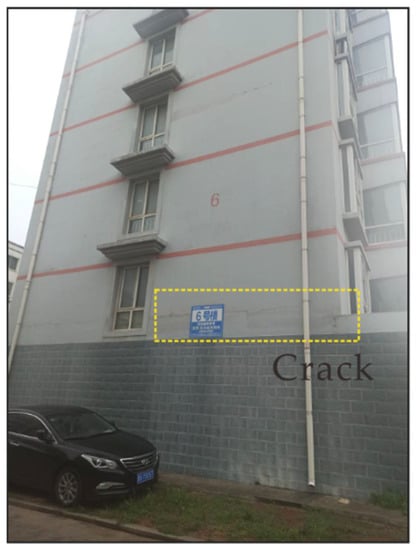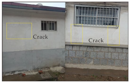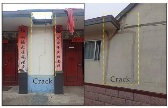 Construction damages due to the mining subsidence (the yellow dashed box shows the position of the cracks).