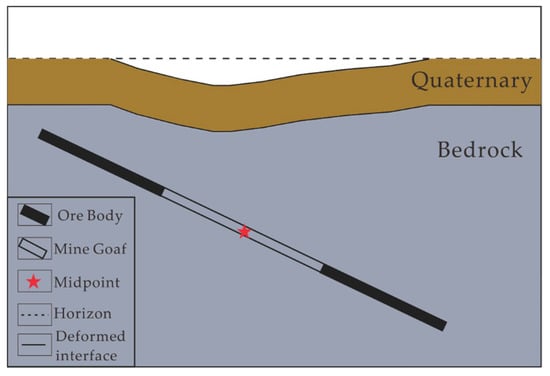 The underground rock mass is heterogeneous due to the existence of geological discontinuities. Before mining, the rock mass under the effect of the in-situ stress field is in a balanced state. After the local ore body is exploited, the goaf is formed inside the rock mass, which leads to changes in the stress state of the surrounding rock mass, causing stress redistribution. This change in the stress states induces a deformation that could reach the failure threshold. Throughout this process, the rock mass deforms, becomes broken, and generates numerous fractures. Finally, the underlying bedrock deforms and the overlying quaternary soil settles down. Many scholars have studied the coal mining subsidence [43,54,55,56,57,58,59], but studies on steeply dipping metal deposits are scarce. Coalfields are more regular than metal deposits and thus form a more regular subsidence area.