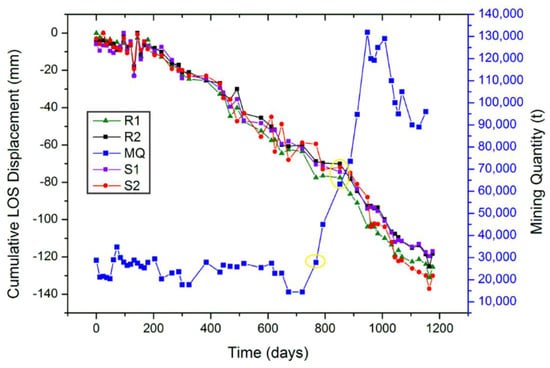 The cumulative LOS subsidence displacement and mining quantity change (the turning points of subsidence displacement and mining quantity are circled by yellow ellipses).