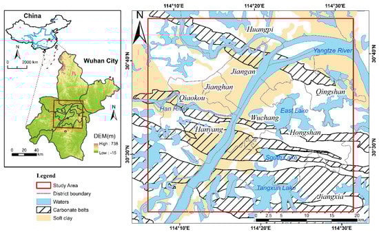 Wuhan is located in the eastern region of the Jiang-Han Plain, with geographical coordinates between latitudes 29°58′ N and 31°22′ N and between longitudes 113°41′ E and 115°05′ E (see Figure 1). The Yangtze River and its largest branch, the Han River, have a confluence in central urban areas of Wuhan, which divides it into three main parts. The overall terrain of Wuhan is flat, with an average altitude of approximately 37 m above sea level. Soft clay layers with high compressibility and low strength are primarily spread along both banks of the Yangtze River in Wuhan. The belts of carbonate rock in Wuhan cover an area of more than 1100 , and they align in a trend with a nearly east–west orientation. Wuhan is in a northern humid subtropical monsoon climate zone, which is characterized by plentiful rainfall and abundant sunshine. The average annual temperature is approximately 16.6 °C and precipitation ranges from 1150 mm to 1450 mm. The rainfall is concentrated mainly in the rainy season from June to August every year, accounting for 41% of the total precipitation.