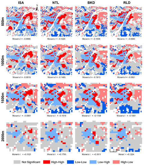 The values of global bivariate Moran’s I at four block scales are less than 0 (p < 0.01), indicating significantly negative spatial correlations between the four types of urbanization indicators and surface deformation (Figure 5). That is, overall, urbanization is an important factor leading to land subsidence. However, the degree of negative spatial correlation varied with different urbanization factor types and scales. Among these types, the strongest negative correlation was found between land subsidence and BKD (Moran’s I: ranging from −0.1911 to −0.1639), followed by that between land subsidence and NTL (Moran’s I: ranging from −0.1793 to −0.1220) and that between land subsidence and RLD (Moran’s I: ranging from −0.1224 to −0.0683). The weakest correlation was between land subsidence and ISA (Moran’s I: ranging from −0.1121 to −0.0666). The negative spatial correlation between urbanization and land deformation manifested as a gradual increase in the block size.