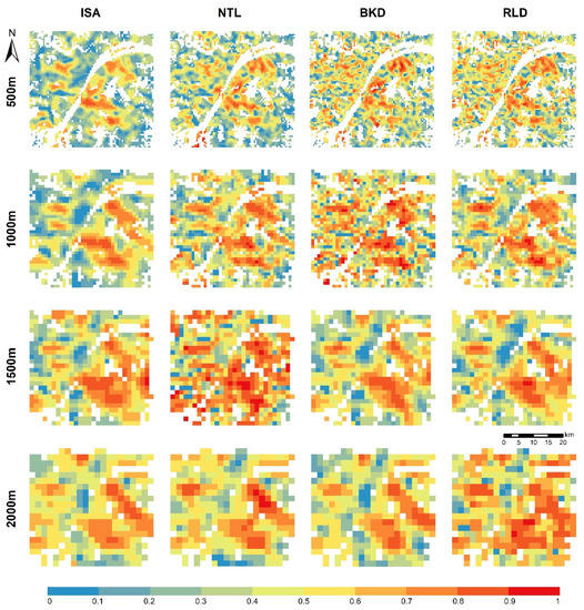 As shown in Figure 4, all urbanization indicators (ISA, NTL, BKD and RLD) gradually decrease from the city center to its outer periphery, and their spatial distributions are similar to each other globally. The ratio of the area for ISA across the study area is 44.40%, and the averages of NTL, BKD, and RLD are 16.31 n·W·, 523.40, and 14.93, respectively. ISA and NTL are comprehensive indicators of urbanization, while BKD and RLD focus on a single aspect of urbanization. Therefore, the intragroup similarity between ISA and NTL, BKD and RDL is higher than the intergroup similarity in terms of spatial patterns. It is observed that water bodies, which are mainly composed of rivers, lakes, and reservoirs, play a crucial role in shaping the urban expansion of Wuhan according to the spatial distribution of urbanization indicators. In addition, BKD and RLD were both found to exhibit low values compared to the relatively values of high ISA and NTL in the southeastern part of the study area, which indicated local spatial disparities among urbanization indicators. The urban-rural gradient of NTL and BKD has a significant spatial variation as opposed to ISA and RLD. Although the spatial distribution of RLD is different from that of the original road, RLD also showed an obvious linear distribution characteristic.