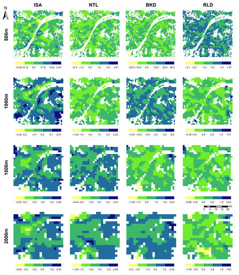 The local parameter estimates of the GWR model indicate the spatially varying relationships between the independent variable and response variable at different locations. The magnitude of the absolute value of the model regression coefficient denotes the degree of impact of an independent variable on land subsidence. In addition, the local adjusted determined coefficient (adjusted ) value from the GWR model is used to detect and assess the ability of the explanatory variable to explain the spatial variance in land subsidence, and a higher local adjusted value means better performance of the model. The ranges of local parameter estimate and adjusted between land subsidence and urbanization indicators obtained from GWR models are summarized in Table 2. Both positive and negative relationships are identified by local coefficients between urbanization indicators and land subsidence at different block scales, and the average of regression coefficients for NTL (except at the 1500 m scale) is less than 0. The local adjusted indicated that the urbanization indicators could explain more than 75% of the spatial variance in land subsidence on average at the four block scales (Table 2). In general, the explanatory power of urbanization indicators on land subsidence presents no significant difference from small to large block scales. However, the higher adjusted suggests that NTL has a stronger ability to explain the land subsidence changes than ISA at different block scales, which indicates that both ISA and NTL are relatively comprehensive indicators measuring the degree of urbanization, although NTL can reflect dynamic human activities and urban vitality better than ISA because artificial lights provide a direct signature of human activity [51].