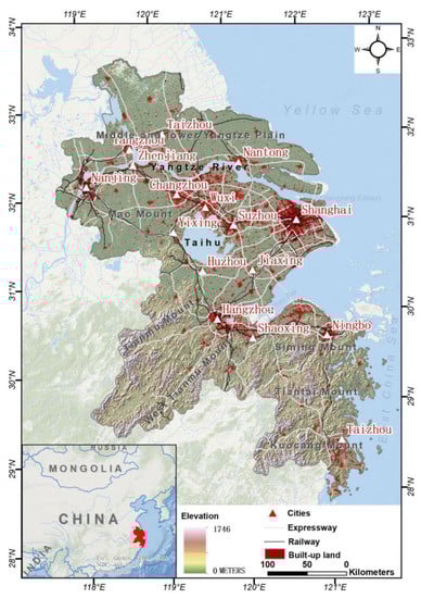The YRD is one of the regions with the most active economic development, the highest degree of openness, and the strongest innovation ability in China. It plays an important strategic role in the overall situation of China’s modernization and all-round opening-up pattern. In this study, the YRD region refers to the YRD urban agglomeration included in the “YRD Urban Agglomeration Development Plan”. The plan was approved by the State Council in May 2016, including 26 cities such as Shanghai, Nanjing, and Hangzhou (Figure 1). The landform is mainly plain, with an altitude of less than 10 m, and low hills between the southwest and the south. The land area of the whole region is 211,700 square kilometers, accounting for 2.21% of the total land area of the country. It is located in the subtropical monsoon climate area, with an annual precipitation of 800–1600 mm. It is hot and rainy in summer. In addition, coastal beaches and wetlands are relatively rich in resources, and superior natural and geographical conditions provide a good resource and environmental background foundation for the development of YRD area.