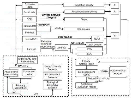Among them, the population density was obtained from the statistical yearbook and reduced to 1 × 1 square kilometer; the USLE Model was used for soil erosion, and thin disk interpolation is used for precipitation data. The MODIS data were processed by MRT and bear toolbox software, and NDVI was obtained by normalization, background value removal, and clipping through ENVI5.1. The land-use data were imported into FRAGSTATS to calculate the patch density. ArcGIS 10.3 was used to obtain slope from digital elevation model data. ESV and ECO were calculated according to land-use types [,]: