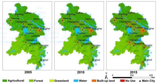 The land-use types of the YRD in 2005, 2010, and 2015.