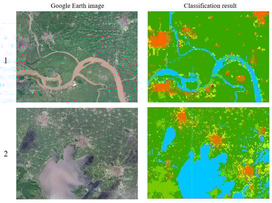 Regarding the purpose of classification accuracy evaluation, all of the 450 randomly and uniformly generated points in the interpretation results were compared with the high score images, the comparison matrix was established, and the classification accuracy was calculated. It was concluded that the extraction accuracy of land-use remote sensing information in this paper was greater than 85%, which meets the requirements of this study. Finally, the land use in the study area in 2005, 2010, and 2015 is present in Figure 3, while the local verification comparison is shown in Figure 4.