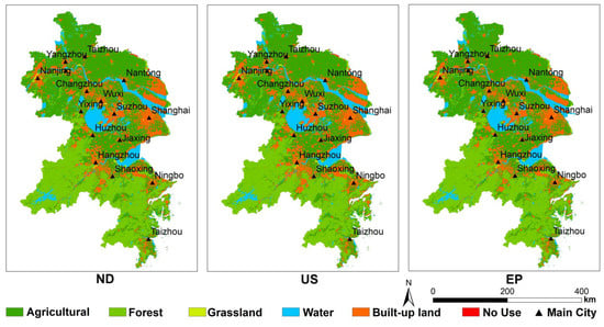 Due to the rapid development of the YRD over the years, considering that the cultivated land area has been reduced to a certain extent, this study determined three future simulation scenarios by inhibiting the reduction in cultivated land and promoting urban development: “Natural Growth Scenario (ND)”, “Urban Sprawl Scenario (US)”, and “Ecological Protection Scenario (EP)”. Repeated steps 3.3.1 and 3.3.2, and realized scenario prediction by changing the transfer matrix of land type (Table 2) according to the research of the same model and the same background [].
