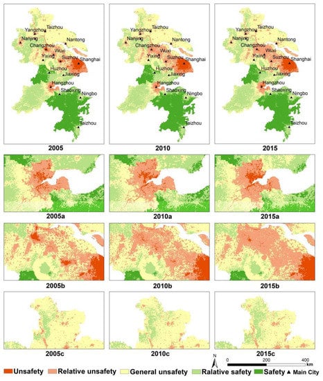 In terms of time distribution, the distribution of ES in YRD urban agglomeration from 2005 to 2015 is roughly the same, but the gap is obvious in some regions. The “Unsafe” areas in the eastern coastal area are expanding year by year, while the “Unsafety” areas are expanding intensively. As a result, the aggregation of ES is downgraded by one level. Hangzhou can be regarded as a typical area, and it pays attention to urban planning and environmental greening in the process of economic development (Figure 6a). The “Unsafe” areas around Taihu Lake are getting better year by year, but the “Relative unsafe” areas are becoming increasingly larger. Consequently, the ES between urban areas is declining, forming a large area of poor quality (Figure 6b). It is worth noting that the development of inland urban agglomerations has improved year by year, especially in the northwest of the urban agglomerations in the YRD (Figure 6c), this area is mainly low mountains and hills, which is distant from the city.