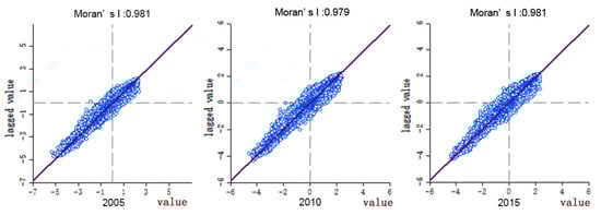 In this study, GeoDA software was used to analyze the spatial autocorrelation of land ecological security index in YRD region, where p-value represents the probability, which reflects the probability of an event, and z-scores represent the multiple of the standard deviation, which can reflect the dispersion of a data set. The p-value of each landscape index is equal to 0.001 (Table 5), indicating that the spatial autocorrelation under 99.9% confidence is significant. The ES index in the study area is concentrated from 2005 to 2015, with few discrete points. The Moran’s I indexes in 2005, 2010, and 2015 are 0.981, 0.979, and 0.981, respectively (Figure 7), which are positive numbers, indicating that the ecological vulnerability index in the study area is positively correlated in space. Among them, the Moran’s I indexes in 2005 and 2015 are large, and the Moran’s I index in 2010 is the smallest, indicating that the ecological security aggregation degree of the study area is high in 2005 and 2015. During the study period, Moran’s I index decreased first and then increased, and decreased by 0.002 from 2005 to 2010, mainly due to the aggregation of discrete points in the first quadrant and the third quadrant; it increased by 0.002 from 2005 to 2015, mainly due to the role of the first quadrant and the third quadrant.