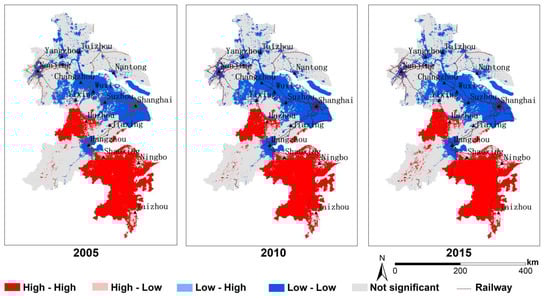 The Lisa clustering map of YDR in 2005, 2010, and 2015: (1) high-high denotes spatial clustering of similar high values, (2) low-low denotes spatial clustering of similar low values, (3) low-high clustering denotes low values surrounded by high values, and (4) high-low clustering denotes high values surrounded by low values.