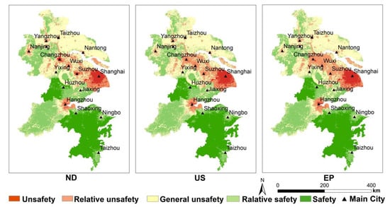 Figure 10d shows the ES pattern of forest land. The area is located in the west of the YRD, with high terrain, mainly mountains and rivers. The ecological security of the three scenarios is high, mainly relative security. The safety area under EP scenario is significantly larger than that under ND and US scenarios. Due to the large ecological elasticity in this area, the land system has strong recovery ability and good overall level.