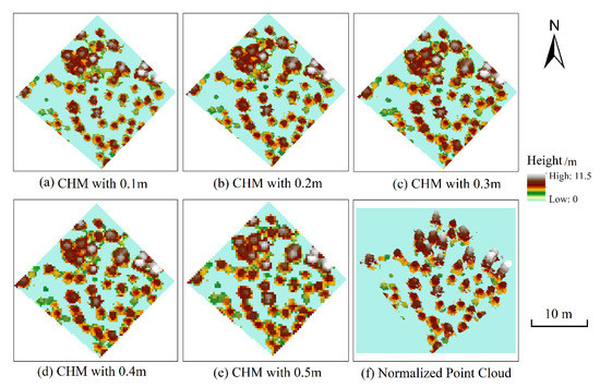 A CHM contains the raster values of a digital elevation model (DEM) subtracted from the raster values of a digital surface model (DSM). A CHM is constructed by using inverse distance weighting (IDW) interpolation and ground point clouds [44,45,46] to generate a DEM, and a DSM is obtained by interpolating the laser point cloud of the first echo. The result is a direct expression of the distribution of the vegetation canopy height above the ground [47]. In this study, the CHM resolution was set to range from 0.1 m to 0.5 m. This method was used to explore the influence of the CHM resolution on the accuracy of individual tree segmentation.