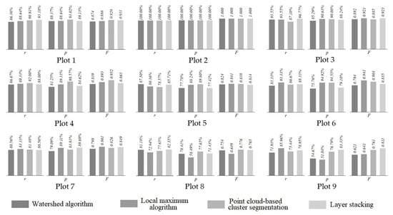 The accuracy of individual tree detection in nine plots: r is the detection rate, p is the accuracy rate, and F is the overall accuracy.