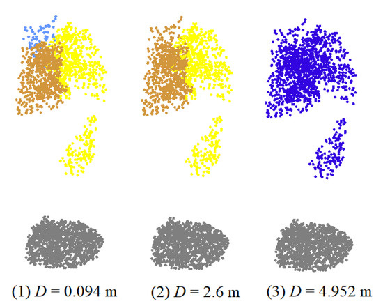 The distance threshold (D) in PCS is the key parameter that influences individual tree segmentation. Different D values were set for plot 1, plot 4, and plot 8, and the individual tree segmentation results obtained using the PCS method are presented in Table 3. The results are based on the maximum, average, and minimum values of the crown radius of the plot. In different types of plots, the number of individual tree segmentations decreases with an increasing distance threshold, and these factors are negatively correlated. When D is set as the average crown radius, the F values of the three plots reach maxima of 0.851, 0.848, and 0.776. A comparison among the PCS segmentation details for different D values was performed for plot 4, as shown in Figure 8. There are two adjacent Eucalyptus trees in this plot, and over-segmentation occurs when D is set to the minimum crown radius; when D is set to the maximum crown radius, three trees are combined into one. However, when D is set to the average crown radius, the three trees are segmented correctly.