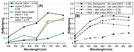 Epibionts such as macroalgae and shellfish adversely affect honeycomb worm populations and their associated fauna [16]. Multispectral images were used to map two types of macroalgae, those attached to the reef (the green macroalgae Ulva spp.) vs. those brought in by tides from subtidal areas (mainly red macroalgae dominated by Soliera chordalis, sometimes mixed with a small proportion of green macroalgae) and stranded, as well as two bivalves, oysters Crassostrea gigas and mussels Mytilus edulis (Figure A5). Spectral indices based on their spectral properties combined with reef height were used for their discrimination. Macroalgae and mussels had Normalized Difference Vegetation Index (NDVI) [62] values higher than 0.4. The NDVI index was calculated following Equation (2):