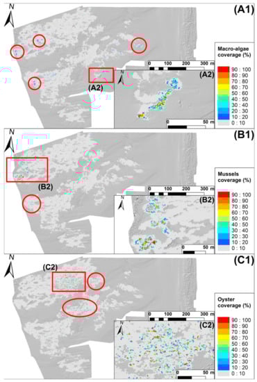 Green macroalgae colonizing the reef were mostly distributed on the western and eastern borders of the reef area with a coverage seldom higher than 40%, representing 732.6 m2 and 0.9% of the reef footprint area (Figure 7(A1,A2)). Their presence was associated with less or mildly fragmented reefs with a VB ranging from 40% to 80% and lower isolated reefs with a reef height ranging from 0 to 0.50 m (Figure 4 and Figure 5A,C). Mussels were exclusively located on the western part of the reef with a few grid cells showing a 100% cover, representing 67.6 m2 and 0.08% of the reef footprint area (Figure 7(B1,B2)). Their location corresponded to the low intertidal part of the swash platform and they were mostly established on higher platform surfaces with a VB ranging from 70% to 100% (Figure 2B, Figure 5C and Figure 7(B1,B2)). Oysters were mostly observed on the inner part of the northern reef (Figure 7(C1,C2)) and their locations corresponded to fragmented inner reef parts with a VB mostly below 70% (Figure 5C). Oysters covered 1251.2 m2, representing 1.53% of the reef footprint area.