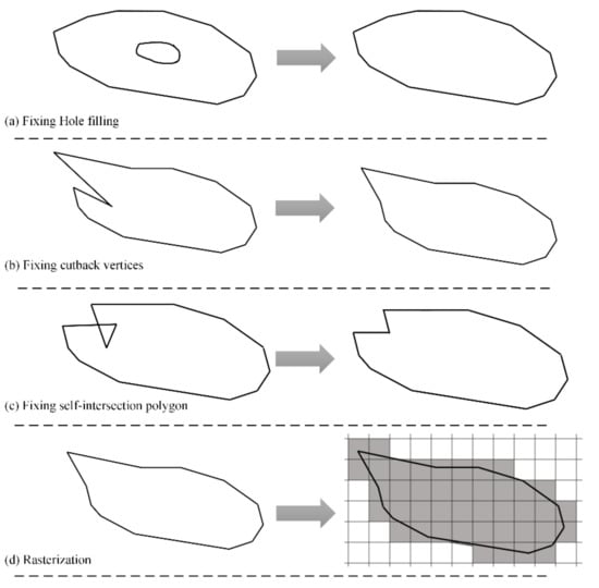 Schematic of preprocessing. Left: polygon before preprocessing, right: result after preprocessing. (a) Holes removal; (b) Removal of cutback verities; (c) Fixing self-intersection; (d) Rasterization.