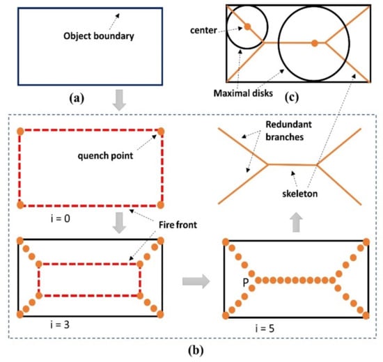 In Figure 3, (a) shows the rectangular object, (b) shows the grassfire process, and (c) illustrates the skeleton definition with maximal inscribe disks. The lit point is colored in a red dotted line, and the point where the fire front meets is displayed by an orange dot. Iteration i correspond to the propagation time.