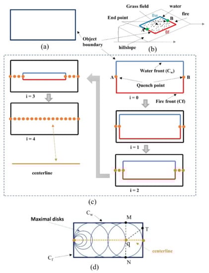 Assume that water and fire travel at the same speed, and that their propagation is not affected by any other factors unless they reach quench points. A quench point is formed where fire front and water front meet, and the water and fire fronts, at this point, stop propagate. Hence, the first two quench points are A and B, in which the initial fire and water fronts meet. As the water and fire front propagation continues, more quench points emerged; and when all the fire is extinguished, the propagation process stops. All quench points form the centerline of the grass field, i.e., the centerline of the object. In this study, the propagation is implemented through an iterative process, in each iteration, the fire and water front move one step inside the raster object, and each step is of one-pixel length. The whole process can be referred to Figure 4c.
