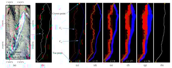 An example of a real-world landslide polygon through the proposed LTE method is shown in Figure 6. Figure 6 depicts the landslide in a 3-D view aerial photo, with the landslide boundary marked in blue; (b) depicts the landslide polygon (in white) in a horizontal plane; (c)–(g) depict the fire extinguishing process; and (h) depicts the resulting landslide trail (in white). Figure 6c shows two endpoints determined by LCPL that divide the landslide boundary into two curves, one representing the water front (colored in blue) and the other representing the fire front (colored in red). As the fire and water fronts propagate inside the landslide object (see Figure 6c–g, a skeleton line (see Figure 6h) is formed.