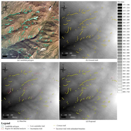 The effectiveness and robustness of the proposed method have been qualitatively and quantitatively validated. Compared with the baseline method, the proposed method is capable of generating landslide trails that are free from spurious branches, directional errors, incompleteness, and poor centralities. Moreover, it has the following appealing advantages: