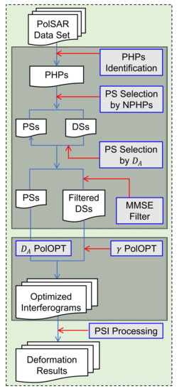Flowchart of the Polarimetric Persistent Scatterer Interferometry with the Adaptive Optimization Strategy (PolPSI-AOS). The abbreviation PHPs, NPHPs, PSs, DSs, MMSE filter, and PolOPT represents the polarimetric homogeneous pixels, the number of polarimetric homogeneous pixels, persistent scatterers, distributed scatterers, the minimum mean square error filter, and the polarimetric optimization, respectively.
