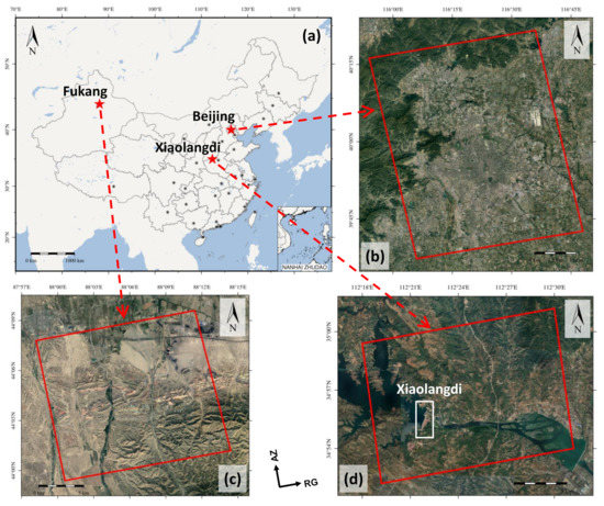 (a) Locations of the three test sites. (b–d) show the SAR images’ coverage (indicated by the red rectangle) and the GoogleEarth optical image over the Beijing, Fukang, and XiaoLangDi test site, respectively.