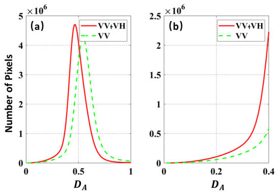 (a) Amplitude dispersion index () histograms derived by the VV channel and PolPSI-ADI approach (VV+VH) over Beijing test site. (b) is the detailed zoom of (a) for values from 0 to 0.4.