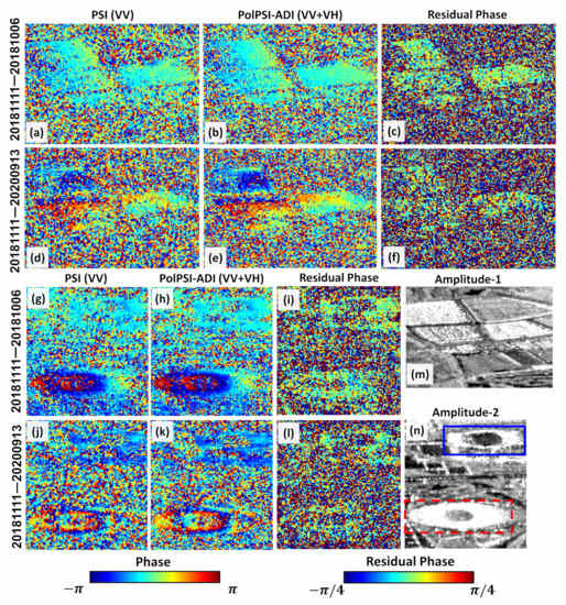 The VV and PolPSI-ADI optimized interferograms (with VV and VH channels) over two subsections of Beijing are shown in Figure 5. These two subsections are chosen for the analysis because the different scattering mechanisms over these subareas (which makes interferograms noisy) and the noise of interferograms is supposed to be reduced by the optimization. The first subsection is over a group of buildings, whose amplitude image is as Figure 5m shows. Figure 5a,b is the interferogram pair (before and after optimization) with a shorter temporal baseline, and Figure 5d,e are the counterparts with a longer temporal baseline. Due to the orientation of buildings and mixture of different scattering mechanisms, the VV channel interferograms (see Figure 5a) are more noisy and the edges of man-made structures can be hardly seen. After the optimization via the PolPSI-ADI technique, the noise of interferograms have been reduced and the edges of the building groups are more clear (see Figure 5b). In addition, this area was suffering from subsidence and there are deformation fringes in the interferograms with the longer temporal baseline. However, in the VV channel interferogram (Figure 5d) the deformation fringes are masked by the noise and they are more clear after the polarimetric optimization (see Figure 5e). In addition, the corresponding two residual phase maps (i.e., PolPSI-ADI phase minus PSI phase) are plotted in Figure 5c,f. For effective phase optimization or filtering methods, the optimized pixels’ residual phase values are supposed to be noisy [50]. In the two residual phase maps (Figure 5c,f), noisy phases are observed on pixels with significant optimization effects, such as the edges of structures and along the deformation fringes. This indicates the good performance of the employed PolPSI-ADI method on interferometric phase optimization.