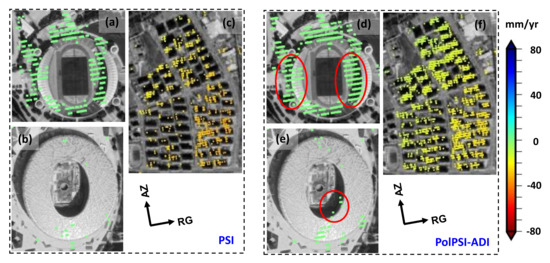 To further illustrate this PS density improvement, the ground deformation over the three subsections (limited in Figure 6c,e with white rectangles C, D, and E), i.e., China National Olympic Sports Center (Figure 7a,d), the National Stadium (Figure 7b,e), and a group of departments (Figure 7c,f), are depicted in Figure 7. More details of deformation over the structures can be observed from the PolPSI-ADI obtained results. Moreover, as the red circles in Figure 7d,e indicate, the increased PS pixels tend to appear at the left side of the buildings, where layover usually occurs. This is because that for the VV channel interferograms, as layover happens over these areas, different scattering mechanisms tend to be mixed together, leading to decorrelations, thus, few qualified pixels can be employed for ground deformation monitoring. On the other hand, through the polarimetric optimization, the PolPSI-ADI technique can find the dominant scattering mechanisms of some pixels, thus, more qualified pixels can be used for PSI applications with respect to VV channel.