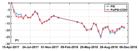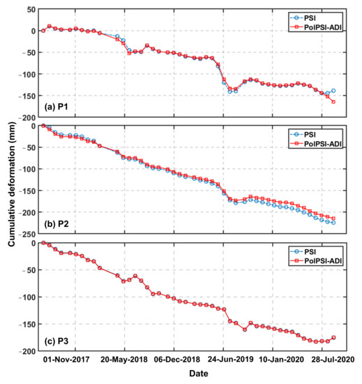 (a–c) shows the ground deformation time-series retrieved by PSI and PolPSI-ADI of the three selected pixels P1, P2, and P3 over Beijing test sites, respectively. The locations of P1, P2, and P3 are highlighted by the three white circles in Figure 6a.