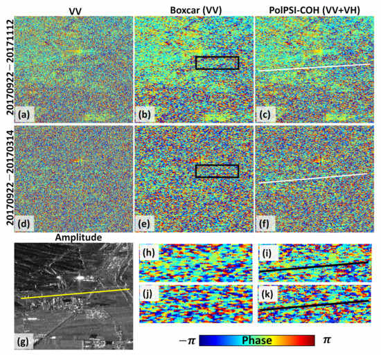To compare the polarimetric optimization effect on the interferograms, interferograms over a subsection of VV channel, the boxcar, and the PolPSI-COH approach are shown in Figure 10. Both the boxcar (see Figure 10b,e) and PolPSI-COH (see Figure 10c,f) method can improve the interferometric phase quality as the noise has been reduced in the processed interferograms with respect to VV channel ones (see Figure 10a,d). However, PolPSI-COH can better preserve edges of structures than the boxcar approach. For instance, there is a left to right road over the subsection (see the lines in Figure 10c,f,g), after processing by boxcar it can be hardly observed. On the other hand, this road can be distinguished from the background noisy phases in the PolPSI-COH obtained results (see Figure 10c,f,i,k). This is because after boxcar processing the neighbouring pixels are averaged, and details are lost. However, the polarimetric optimization can extract the dominant scattering mechanisms from the mixed ones within the averaged pixels, thus, more details can be retrieved than from the boxcar approach.