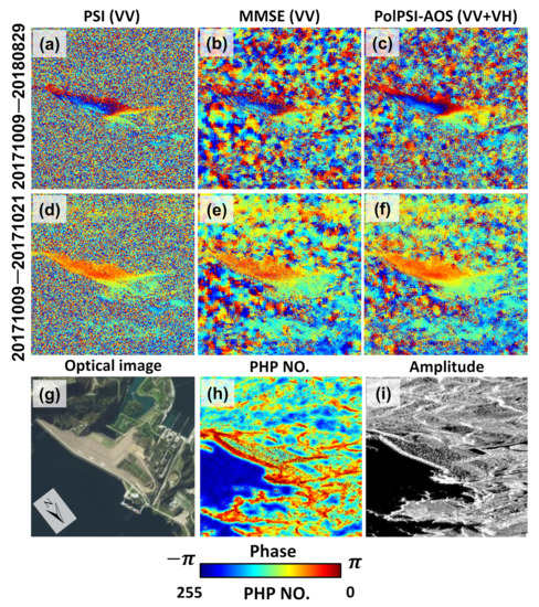 The MMSE method can reduce the interferograms’ phase noise and preserve details of structures compared with the VV channel interferograms. This is due to its adaptive filtering strategy, where PS pixels are with no processing and DS pixels are adaptive averaged together with their PHPs. The PolPSI-AOS approach firstly adapts filter interferograms the same as the MMSE method, and after that the filtered interferograms are further polarimetric optimized by using the dual-pol data. Thus, compared with the MMSE results, PolPSI-AOS processed interferograms are with better phase quality. For instance, there are less noisy pixels over the dam in PolPSI-AOS results (see Figure 13 c,f) than that of MMSE results (see Figure 13b,e).